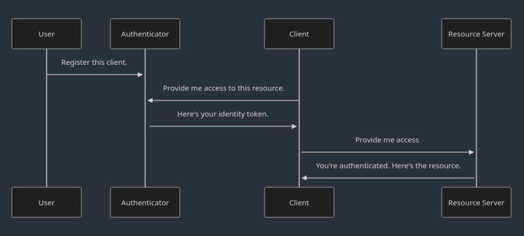 - Someone who has the authority first goes and registers the client’s identity on the Authenticator. This is usually the action of a human being and is important. This specific actions is what allows the client to request authentication and authorization. The authorization is granted only to specific resources in the resource server. It’s not the keys to the kingdom.